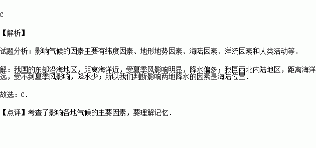 我国西北地区降水较少,而同纬度的东部地区则降水较多,这主要是由于受到( )