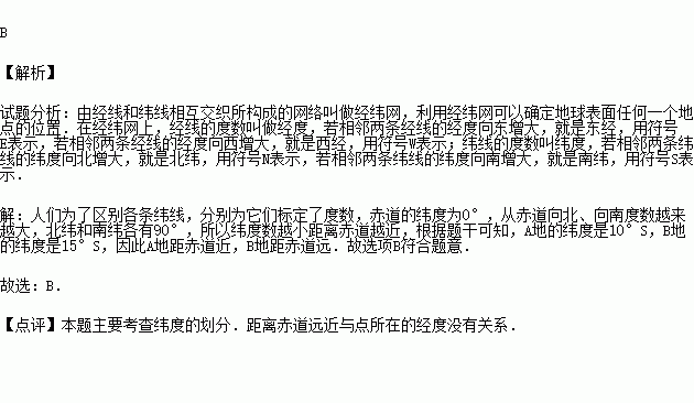 A地的地理坐标是120°W,10°S,B地的地理坐标是120°W,15°S.A、B两地与赤道距离正确的说法是( )