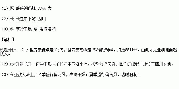 (2)E大江是 江,它与30°N方向大致一致,它冲击形成 平原。我国“天府之国”成都位于D 盆地。