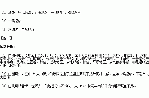 (1)图中A.B.C.D.E、F、G、H八地中,属于人口稠密的地区是 ,