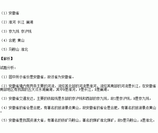 (2)横贯该省的两大河流B ,F 。E是我国五大淡水湖之一的 。