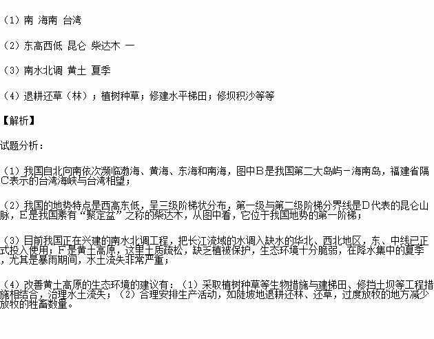 (3)目前我国正在兴建的 工程,把长江流域的水调入缺水的华北、西北地区,东、中线已正式投入使用,大大缓解了北方缺水问题。F是 高原,土质疏松,缺乏植被保护,生态环境十分脆弱,在降水集中的 (“夏季”或“冬季”),尤其是暴雨期间,水土流失非常严重。