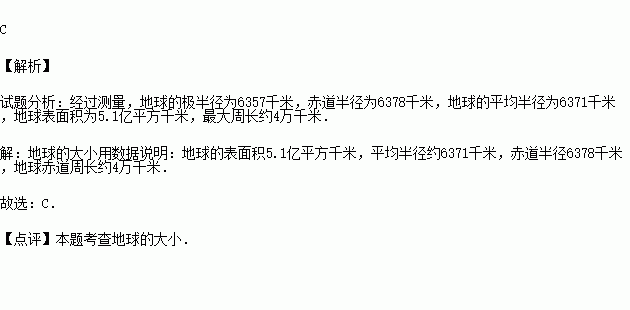 A.平均半径6371千米 B.表面积5.1亿平方千米