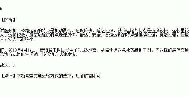 2010年4月14日,青海省玉树县发生了7.1级地震.从福州运送急救药品到玉树,应选择的最佳交通运输方式是( )
