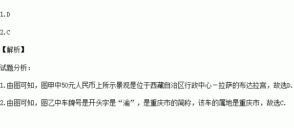 1.图甲中50元人民币所示景观所在的省级行政区域单位是( )