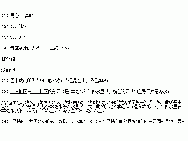 (4)A、D两区域的界线是_________,是我国_________阶梯分界线,确定该区域的主导因素是_________.