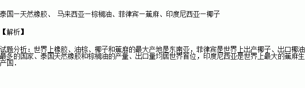 东南亚是世界上天然橡胶、棕榈油、椰子和蕉麻的最大产地,将下列农作物填入下表对应的国家中