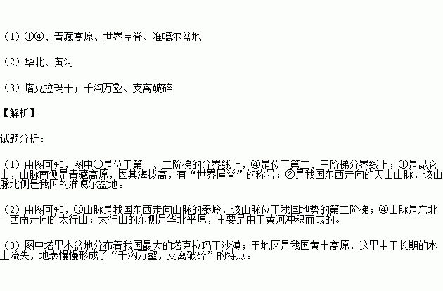 (1)图中山脉①②③④位于阶梯分界线上的是_______(填数码代号),①山脉南侧地形区是 ,被称为“ ”,②山脉北侧地形区是 。
