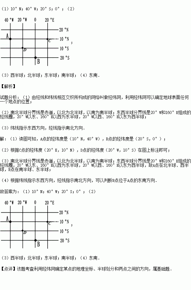 (2)在图中填注C、D两点:C、(20°E,10°N) D、(20°W,10°S)