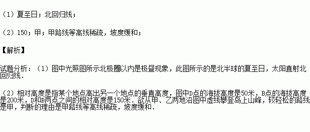 (2)根据某海岛等高线地形图信息,D点海拔为 米。推算D和B两点之间的相对高度是 米。香港某老年保钓队,欲从甲、乙两地沿图中虚线攀登岛上山峰,你认为较轻松的路线是 (填“甲”或“乙”),判断的理由是 。