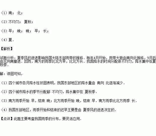 (2)四个城市降水的季节分配都 (填均匀或不均匀),降水集中在 季.