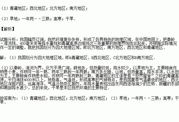 (2)C的农业耕作类型为 ,D的农业耕作制度是 ,A的主要气候特点是 ,B的主要气候特点是 .