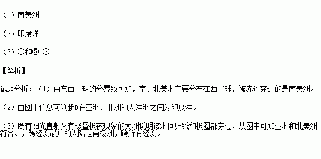 (3)既有阳光直射又有极昼极夜现象的大洲是___________洲。跨经度最广的大洲是__________洲 。(填代号)