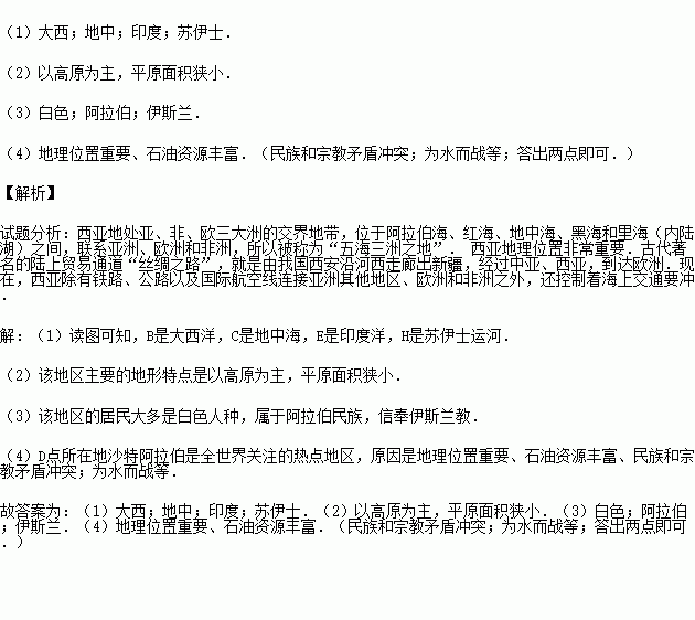 (4)D所在地是全世界关注的热点地区,冲突不断,请分析原因: 、 .(答出两点即可)