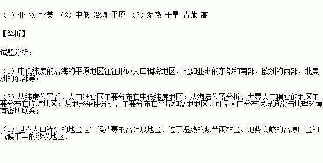 (2)世界人口稠密区的分布,从纬度位置分析,主要在 (中低/中高)纬度地区;从海陆位置分析,主要分布在 (内陆、沿海)地区;从地形类型看,主要分布在 _______和盆地地区。可见人口分布状况通常与地理环境有密切联系。
