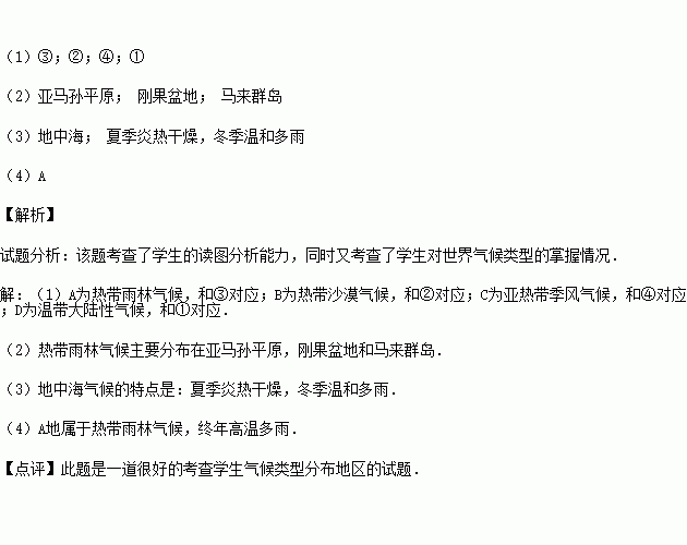 (1)请分别写出①②③④四幅气候图与图中A、B、C、D四地气候特点的对应关系:A