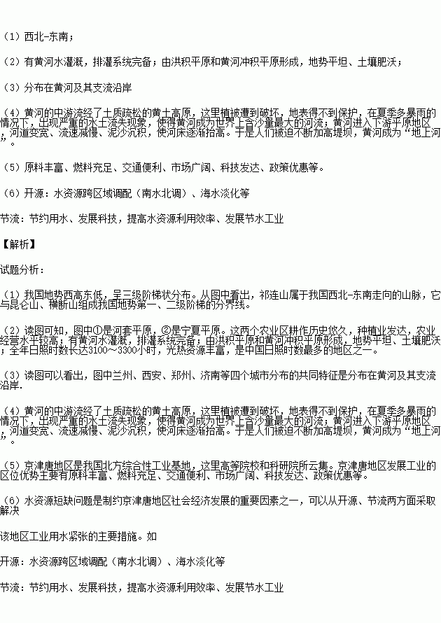 £¨1£©Í¼ÖÐÆîÁ¬É½µÄ×ßÏòÊÇ £¬ËüÊÇÎÒ¹úµØÊƵÚÒ»¡¢¶þ¼¶½×ÌݵķֽçÏß¡£