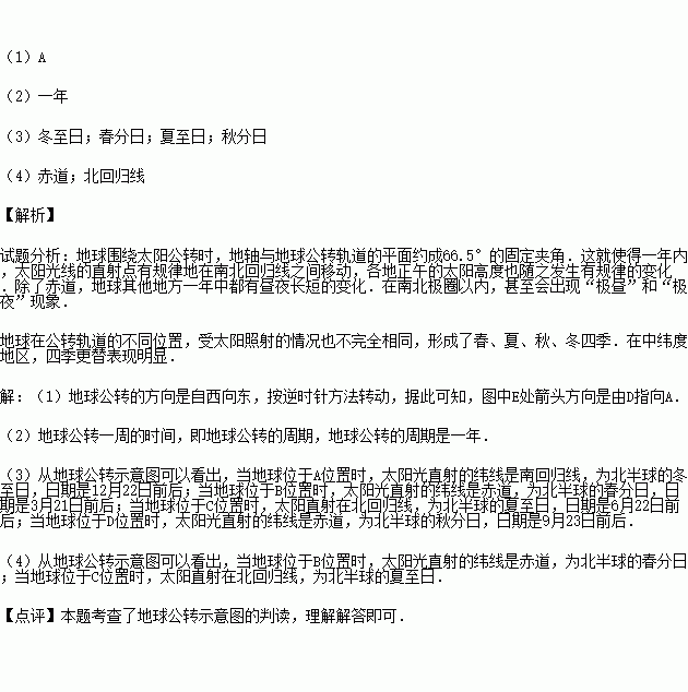 (1)根据地球的公转方向,图中E处箭头方向是 .