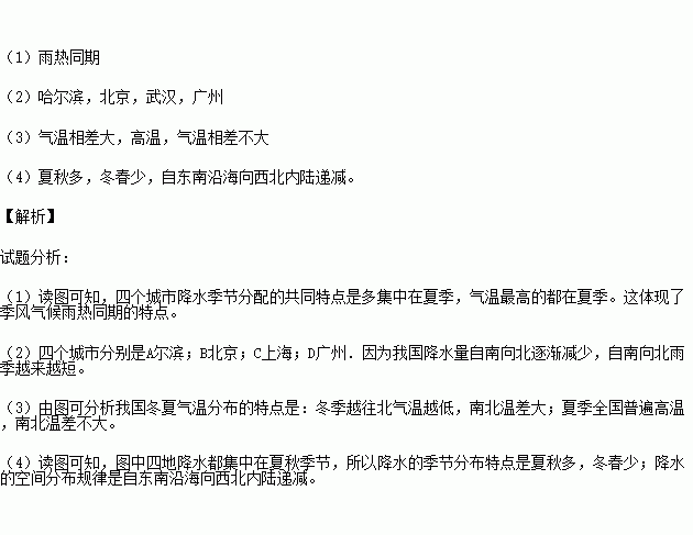 (1)四个城市的“气温曲线和降水量月份分配图”体现了季风气候________________的特点。