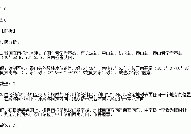 我国南极泰山站2014年2月8日正式建成开站,泰山站的经纬度位置是东经76°58′,南纬73°51′.这是继长城站、中山站和昆仑站后,我国在南极建成的第4个科学考察站.中山站的经纬度位置为东经76°22′,'南纬 69°22'S.据此,回答下列小题.