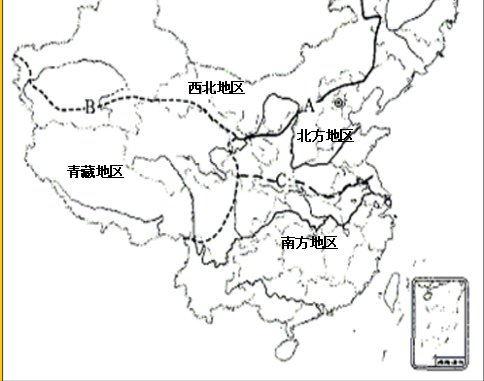 (1)依据西北地区、北方地区、南方地区、青藏地区的位置,在图中相应位置填注即可.
