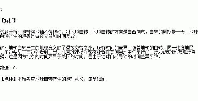 北京球迷杨洋深夜收看在美国当地中午举行的一场NBA篮球比赛现场直播.造成两地时间差异的原因是( )