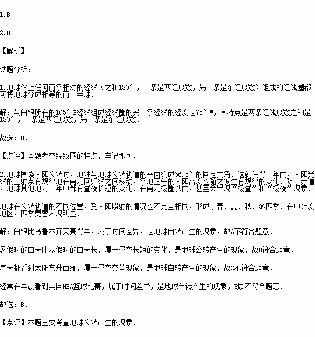 1.与白银所在的105°E经线组成经线圈的另一条经线的经度是( )