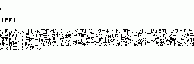 D.日本的铁矿、石油、煤炭等矿产资源贫乏,绝大部分依赖进口