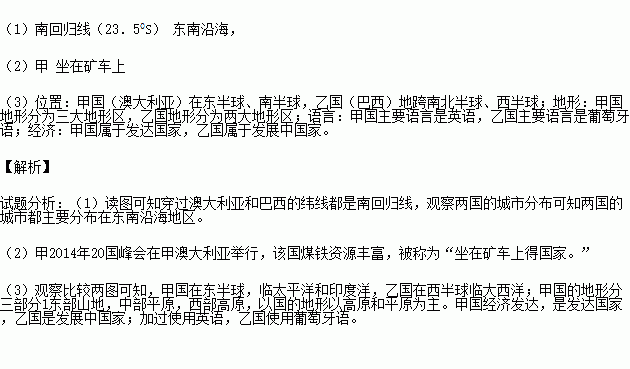 (2)2014年举办二十国峰会的国家是 (填甲或乙),该国煤、铁的出口在世界上占重要地位,被称为“ 的国家”。