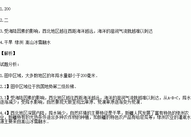 4.西北地区自然环境主要特征______,其农业生产主要有灌溉农业和______业等,绿洲农业的灌溉水源主要来自_______________________