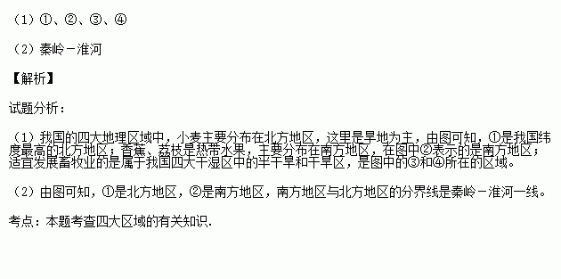 (1)中国的四大区域中,小麦主要分布在 (填代号)区域,香蕉,荔枝等热带水果主要分布在 (填代号)区域,适宜发展畜牧业的是 (填代号)区域和 (填代号)区域.