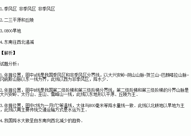 3.C线为一月℃等温线,大体与毫米等降水量线一致。此线以北耕地以为主(填“水田”或“旱地”)。
