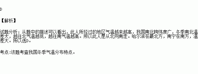 1月份,一个坐火车外出旅行的人,当到达目的地时,原来一只空旅行袋内装满了他一路不得不脱下来且暂时不穿的衣服。此人的旅行路线可能是