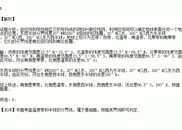 A.66.5°N,160°W B.23.5°N,20°W C.23.5°S,20°E D.66.5°S,160°E