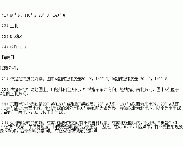 (4)A、B、C、D四点中,有阳光直射现象的是 ,四季分明的是 ,有极昼极夜现象的是 。(填字母)