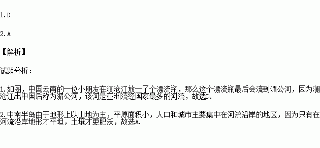 1.中国云南的一位小朋友在澜沧江放了一个漂流瓶,漂流瓶顺澜沧江流到( )