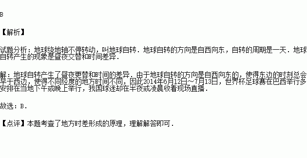2014年6月12日~7月13日,世界杯足球赛在巴西举行.本届世界杯比赛多安排在当地下午或晚上举行,我国球迷却在半夜或凌晨收看现场直播,造成这种时间差异的主要原因是( )