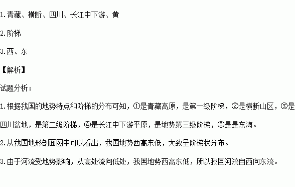2.由图可知,中国地势西高东低,大致呈状分布。
