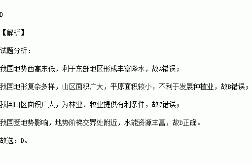 A.地势西高东低,有利于中西部地区形成丰富降水