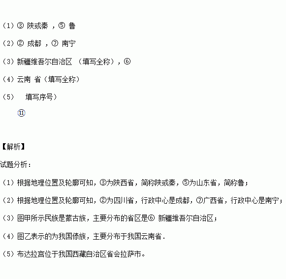 (3)图甲所示民族主要分布的省区是_______(填写全称),该省区在图中序号为_______。