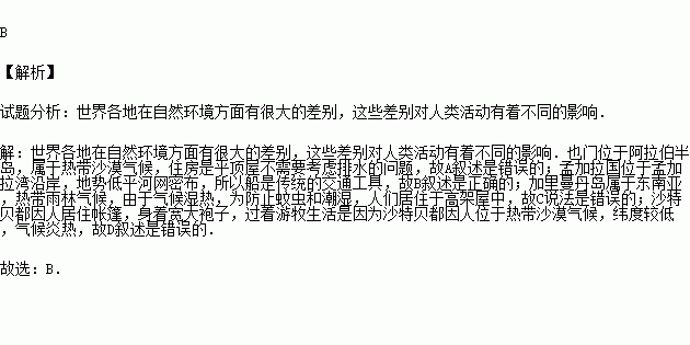A.也门的住房大多是平顶﹣﹣气候湿热的自然条件