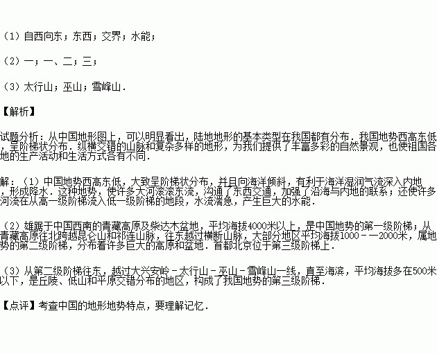 (1)受地势的影响,我国大多数河流流向为 奔流入海,沟通了 交通,方便了沿海与内地的联系,并在各阶梯的 地带形成巨大的落差,蕴藏着丰富的 资源.