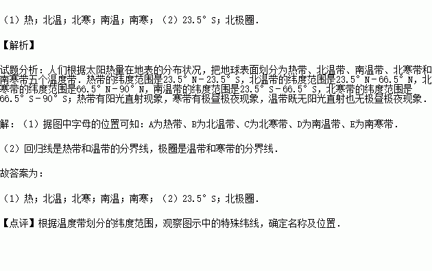 (2)A温度带和D温度带的分界线叫南回归线,其纬度 ;B温度带和C温度带的分界线叫 ,其纬度为66.5°N.