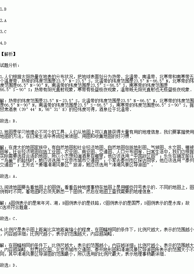 2008年9月25日,我国在甘肃酒泉(39°44′N,98°31′E)卫星发射中心成功发射了自行研制的第三艘载人飞船“神舟七号”,小杰想知道酒泉在哪里,他选用了“中国政区图”;乐乐在确定前往“鸟巢”的路线时,她选用了“北京市城市交通图”;小军去泰州市区探访同学,他选用了“泰州地形图”;王芳去“姜堰溱湖风景区”旅游,她选用了“溱湖风景区导游图”.回答问题.