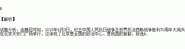 2015年9月3日,纪念中国人民抗日战争暨世界反法西斯战争胜利70周年大阅兵在北京天安门广场举行。这体现了北京是全国的( )