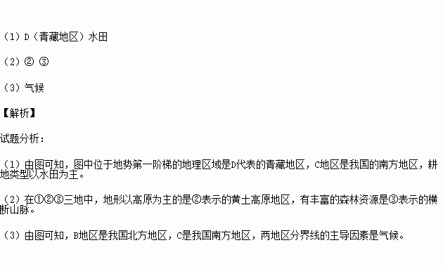 (1)位于地势第一级阶梯上的地理区域是_________,C地区的耕地类型是_________。