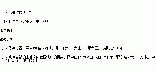 (2)纵横交错的山脉构成我国地形的“骨架”。请写出C山脉两侧的地形区名称,东侧 ,西侧 。
