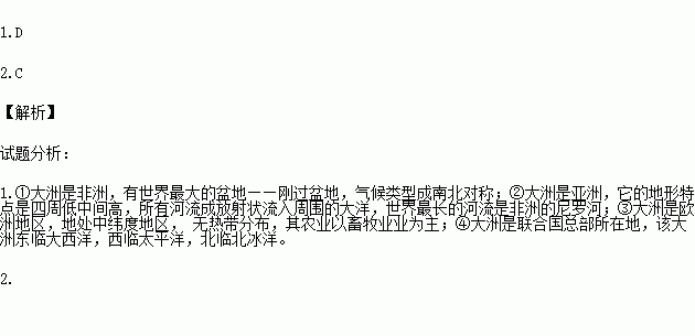A、①大洲的有世界最大的盆地——刚过盆地,气候类型分布特点是从东部沿海开始,成半包围结构。