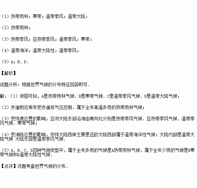 (5)A、B、C、D四种气候类型中,属于全年多雨的气候是 气候,属于全年少雨的气候是、 气候.