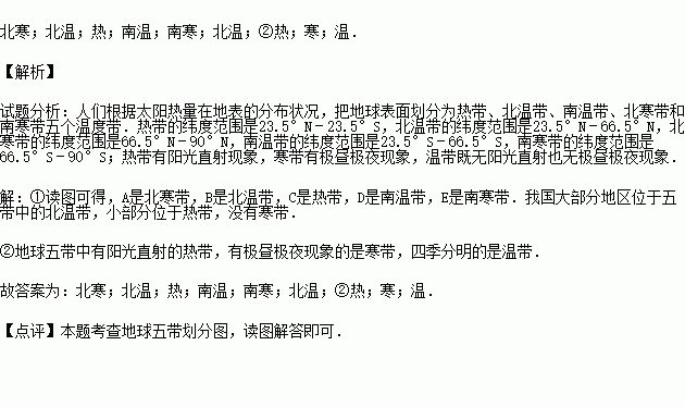 A 带 B 带C 带 D 带E 带.我国大部分地区位于五带中的 带.